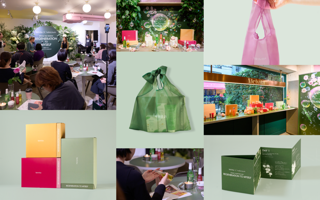 HOLIDAY コンセプトの「REGENERATION TO MYSELF 〜自分の自然体(リズム)を取り戻す特別なホリデー〜 」を打ち立て、キービジュアル、特設サイト、オリジナルアドベントカレンダー&ギフトボックス&コンセプト冊子、Melvita×NeRoLi herbとのトークセッションイベント設計、店頭VMD企画など、多岐にわたるコンテンツ開発を行いました。